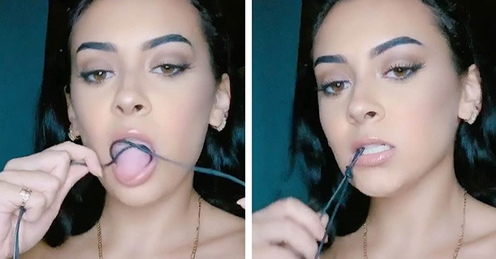 Աղջիկը խաղալով լեզվով հանգույց է անում հենց բերանի մեջ
